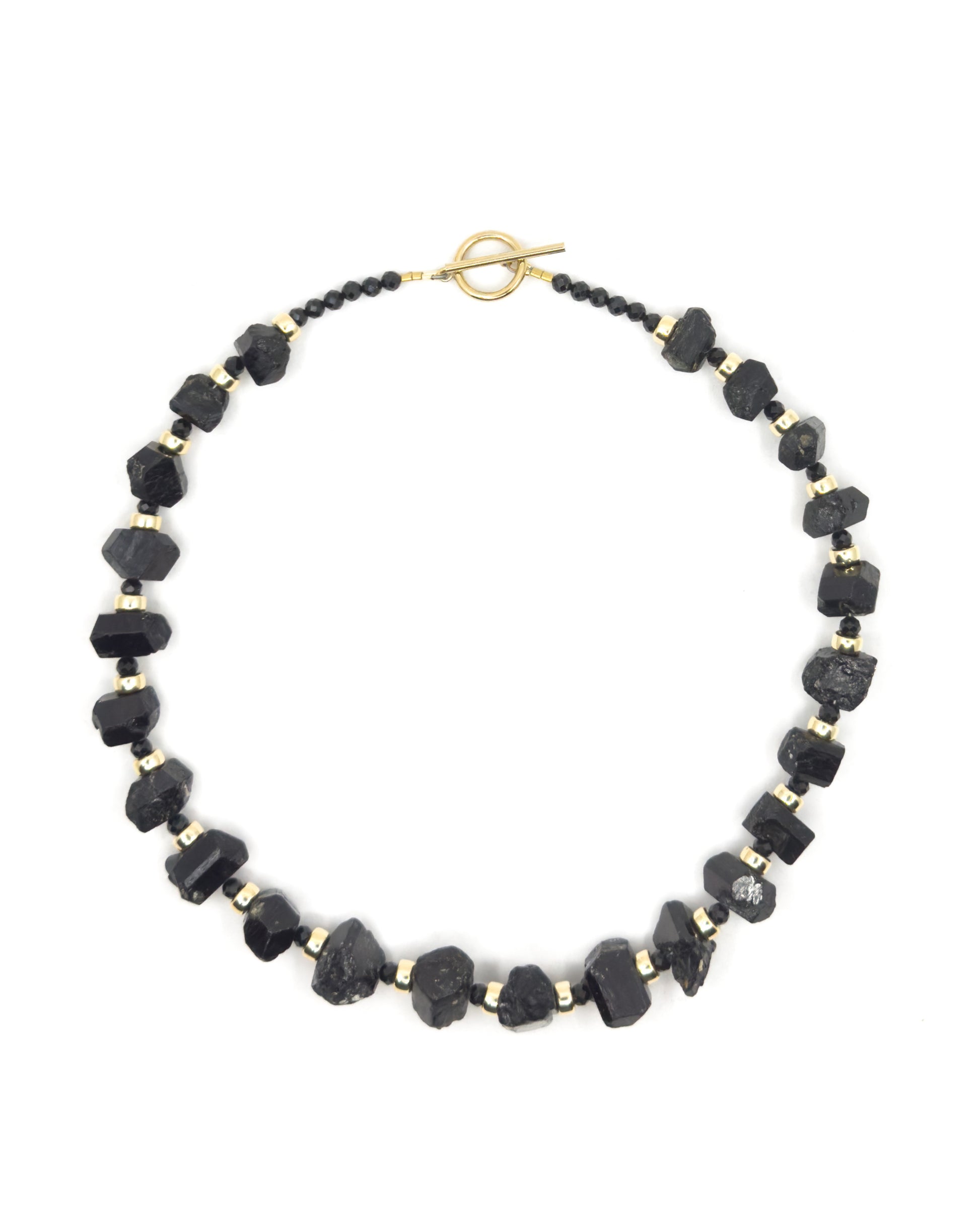 Raw Black Tourmaline nuggets are paired with gold-filled spacer beads and genuine black-spinal spacer beads to form this elegant but not too polished choker. It is an essential addition to your accessory collection because everyone looks good in black.