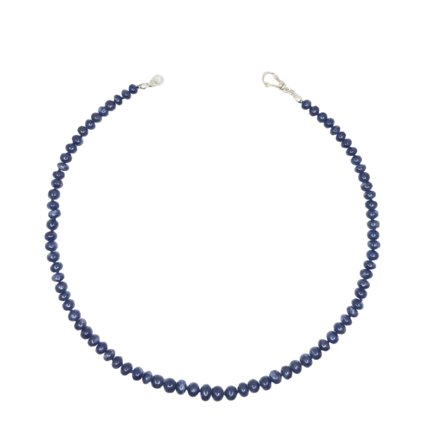 - Genuine 3mm-5mm graduated sapphire gemstones. Silk Thread. Sterling silver swivel clasp.
