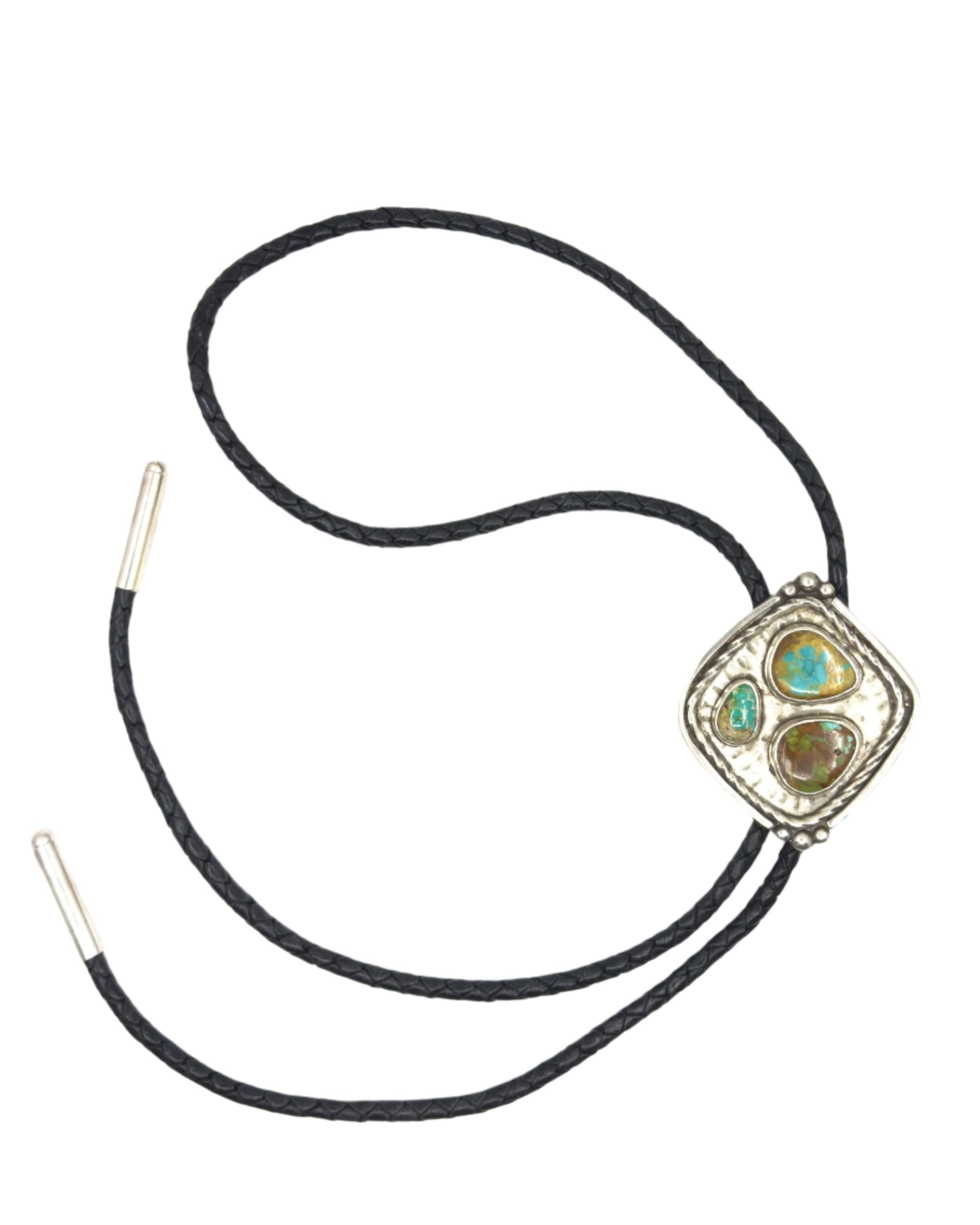 This hand-fabricated sterling silver bolo tie is set with three genuine North American turquoise stones from the Carico Lake mine in Nevada. It's the perfect answer when a tie is required, or a great addition to a casual outfit.