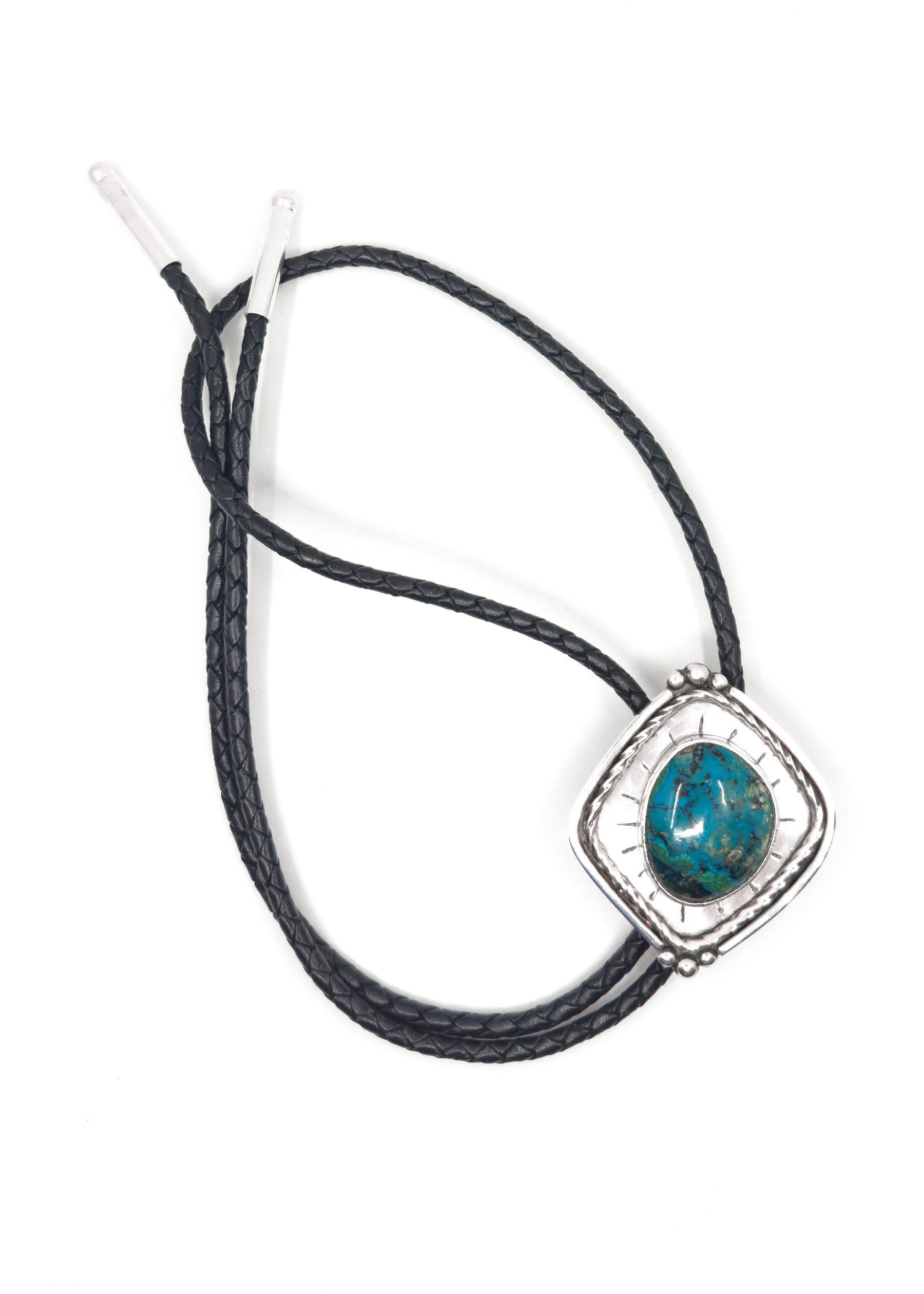 This stunning hand-fabricated sterling silver and gemstone centerpiece features a deep blue genuine gemstone that is a natural cluster of turquoise, malachite and quartz from North America. The tie is made of black braided leather and finished with sterling silver tips.