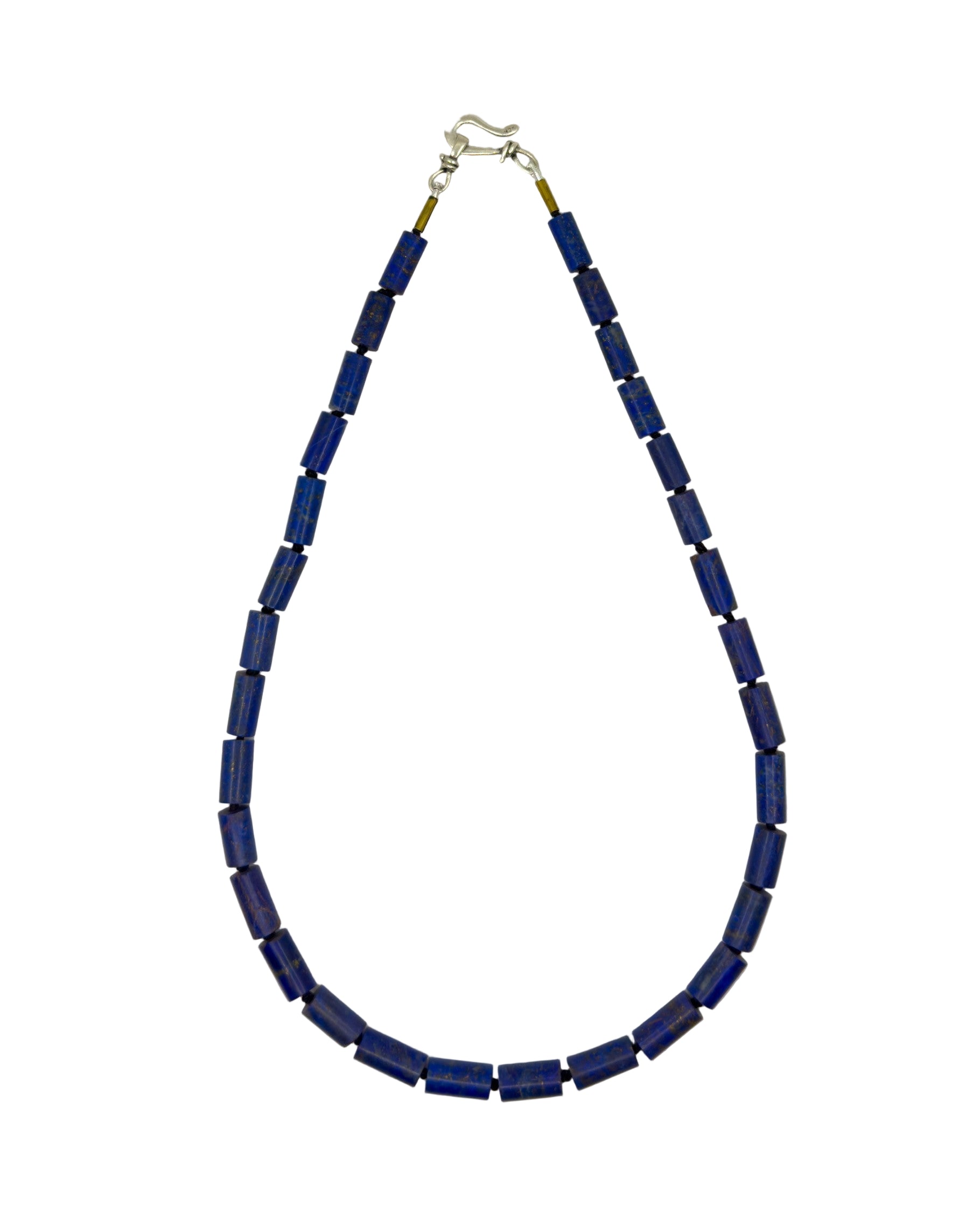 Large hand-knotted tubular lapis beads, each about half an inch long, create a bold strand of deep blue. Their natural inclusions and matte finish highlight the individuality of each stone, making the necklace unique in its quiet, imperfect beauty.