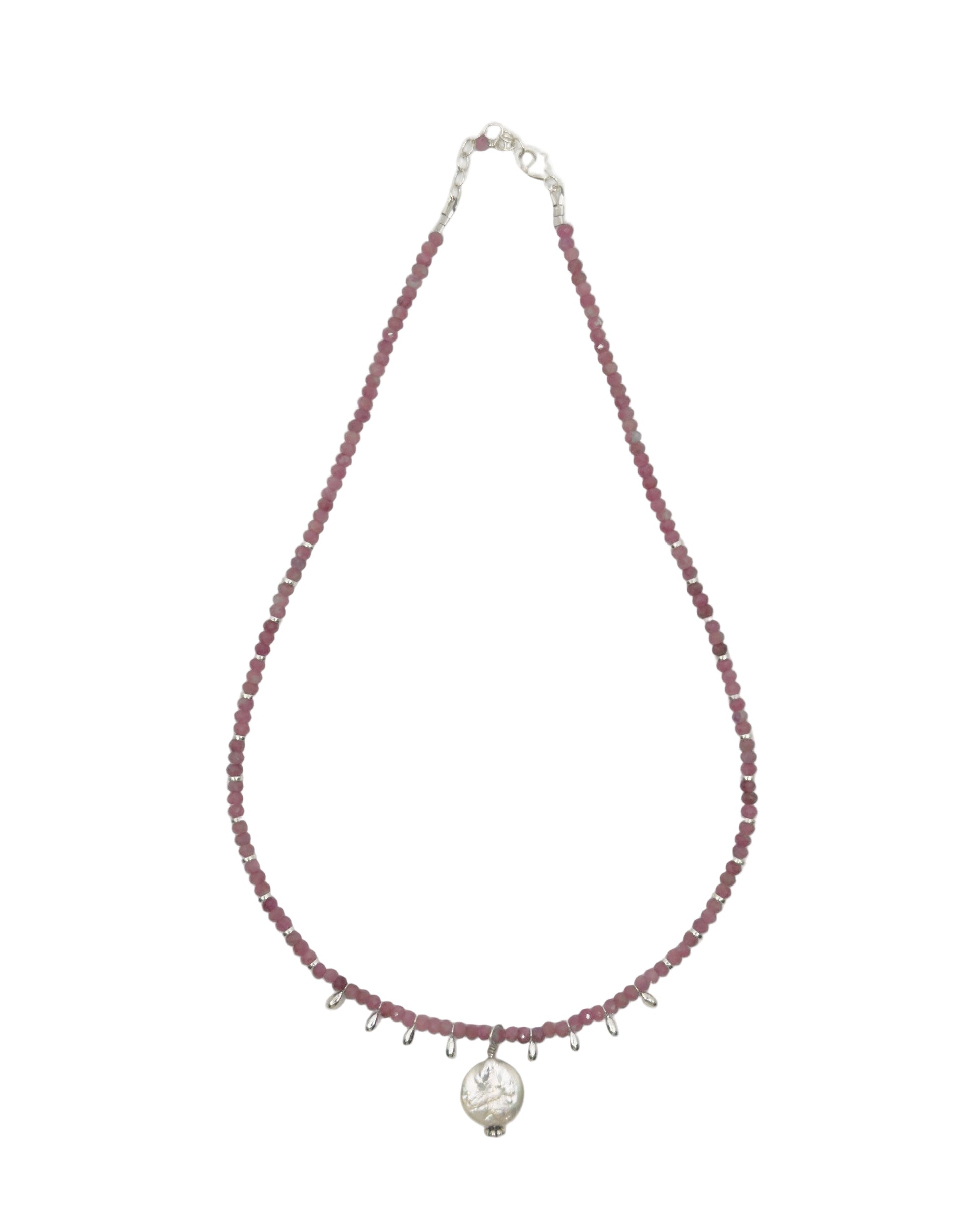 Faceted pink tourmaline beads are strung with sterling silver spacers, creating a delicate rhythm of shimmer and color. At the center hangs a Keshi coin pearl pendant and sterling silver teardrops, giving the necklace a luminous focal point.