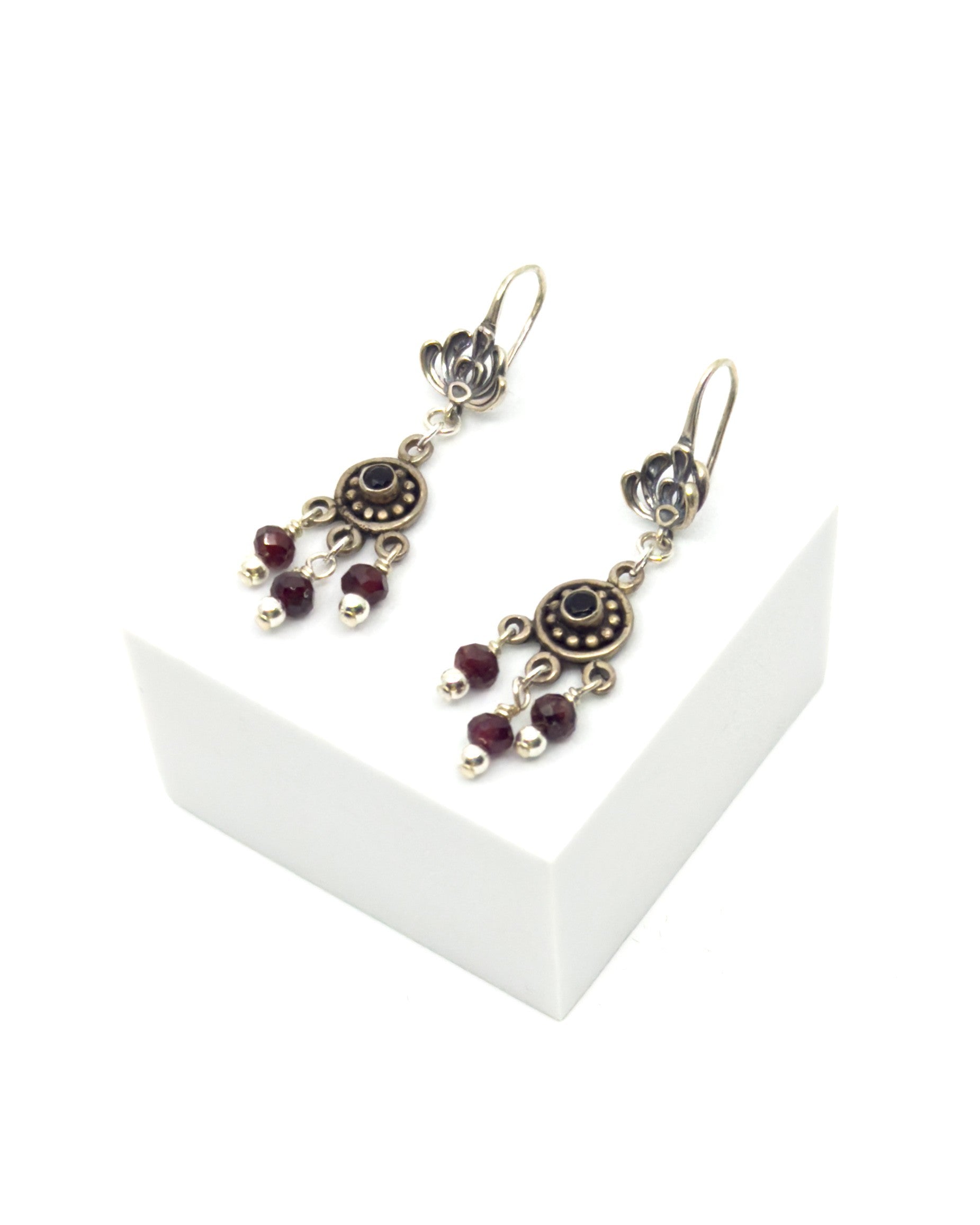 Sterling silver lily ear wires lead to a decorative inlaid silver joiner, from which three faceted garnet drops shimmer in a graceful chandelier style. The deep red garnet gemstones bring a touch of drama to the elegant silver setting.